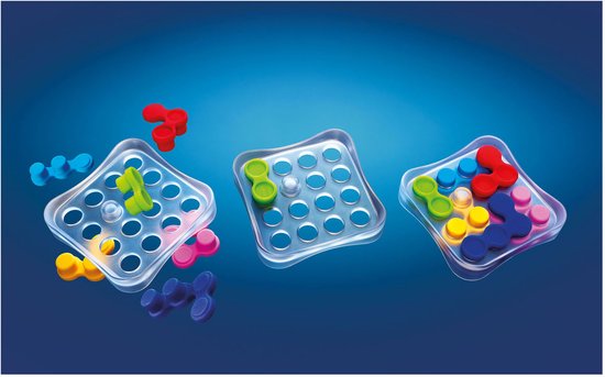 Vul het spelbord door de 2 pinnen van elk puzzelstuk in de gaten van het spelbord te duwen. Puzzelstukken mogen zowel op de voorkant als de achterkant geplaats worden.